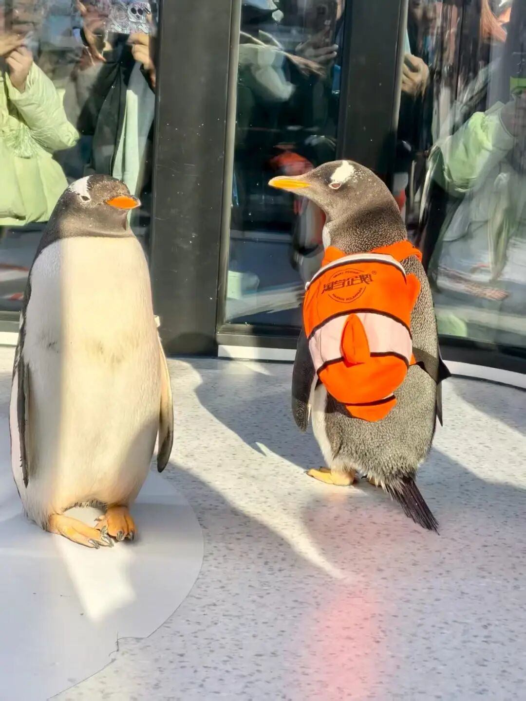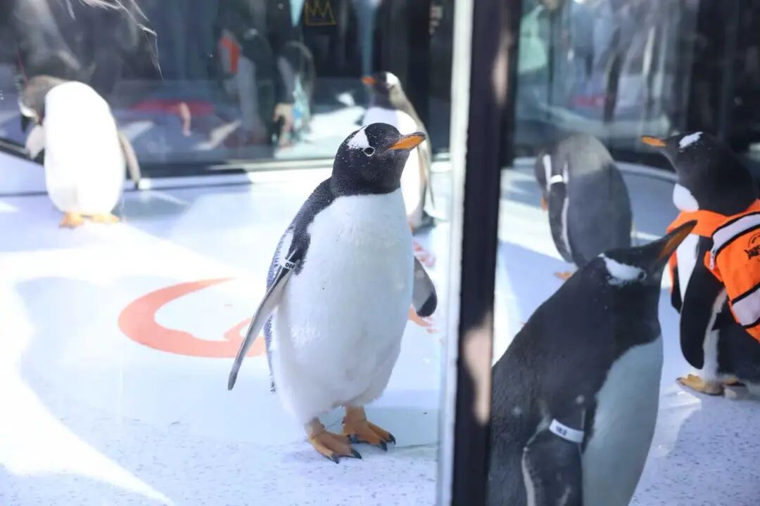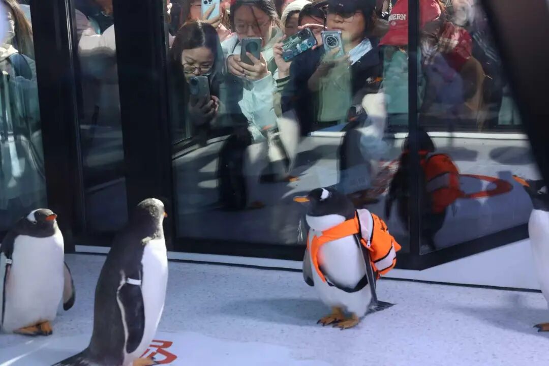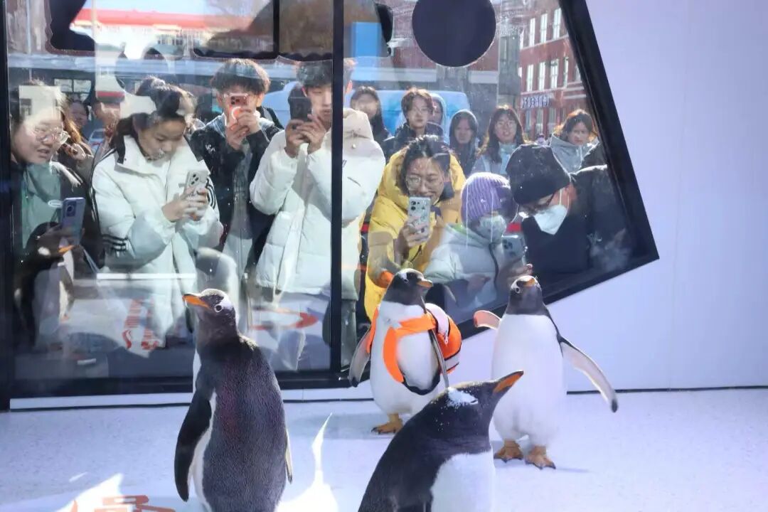 观光箱被同学们围得里三层外三层。大家踮着脚尖、凑着脑袋,温柔地和小企鹅打招呼:“嗨,淘学企鹅!欢迎来到大庆师范学院呀~”