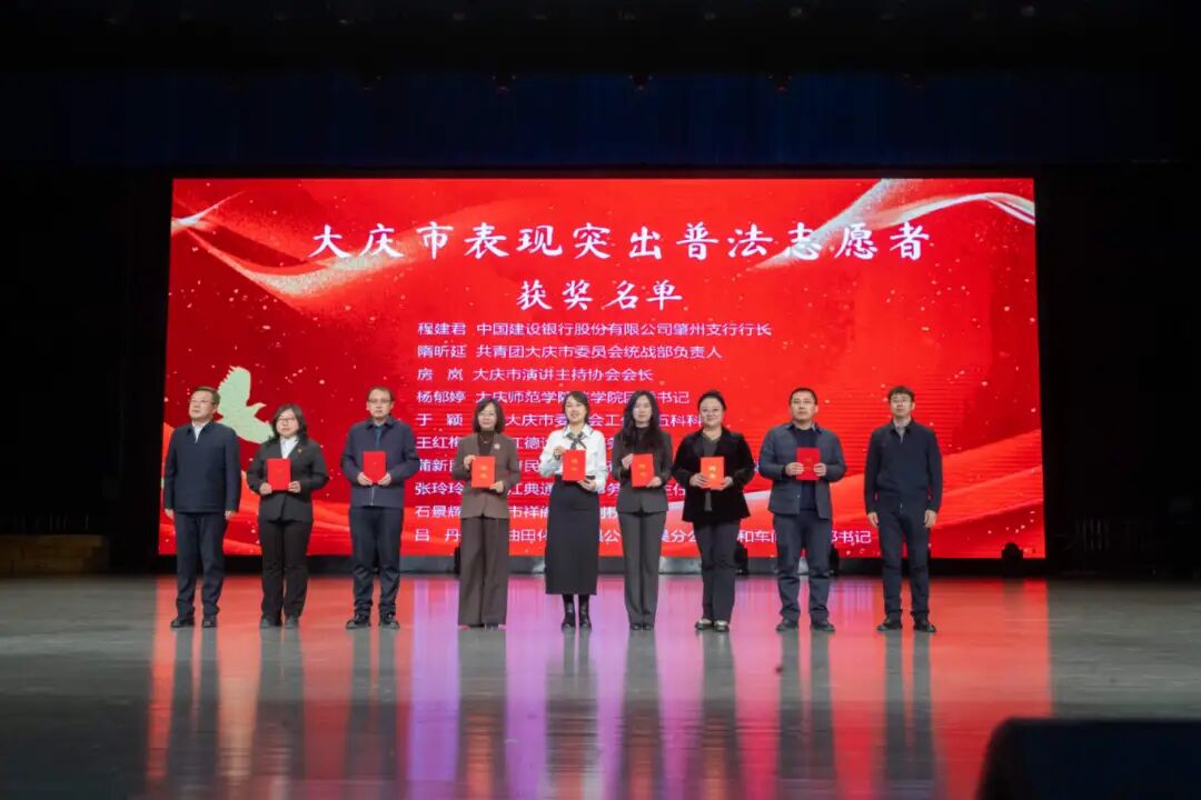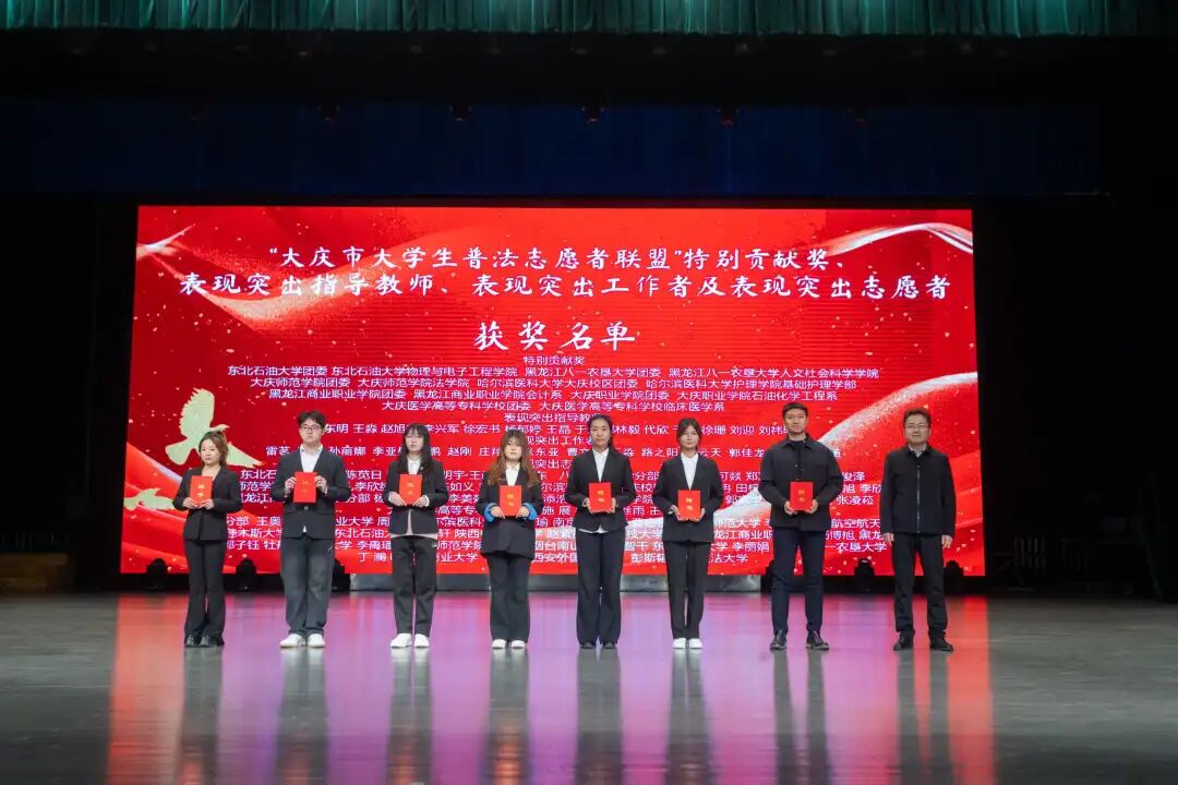 在过去的一年中,我校开展了一系列扎实有效的普法宣传教育活动,支持普法项目开展,积极组织师生走出校园,深入社区、中小学开展普法宣讲等志愿服务,切实提升了普法工作的影响力和实效性。在本次表扬大会上,我校多项成果获得认可,大庆师范学院团委、大庆师范学院法学院荣获“特别贡献奖”,校团委副书记徐宏书、法学院团委书记杨郁婷被评为“表现突出指导教师”,李佳兴、李欣纯、王帅杰、陈如义、宋晓蕊同学获评“表现突出志愿者”,这些荣誉充分体现了我校在普法宣传与法治教育方面的扎实工作和积极成效。
