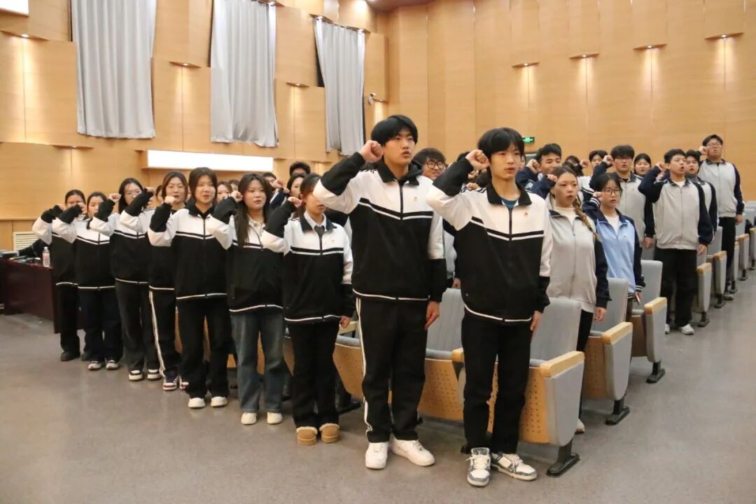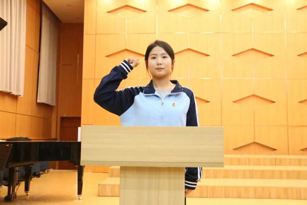 全体新团员在领誓人2023级音乐表演(声乐)班刘淼同学的带领下,面向团旗,高举右拳,庄严宣誓。铿锵有力的誓言回荡在会场每一个角落,既凝聚着新时代青年听党话、跟党走的坚定信念,更彰显着他们为共产主义事业不懈奋斗的决心。