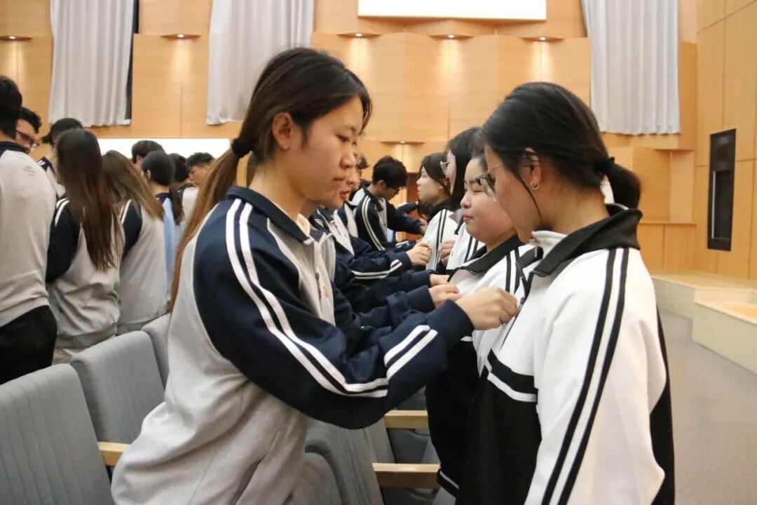 仪式在庄严的国歌声中拉开序幕,主持人戴淇薪宣读音乐与舞蹈学院2025年下半年新发展团员名单。宣读结束后,由优秀团员代表逐一为新团员佩戴团徽,一枚枚闪耀的团徽佩戴在胸前,象征着责任的开始,也标志着他们正式成为共青团的一员。